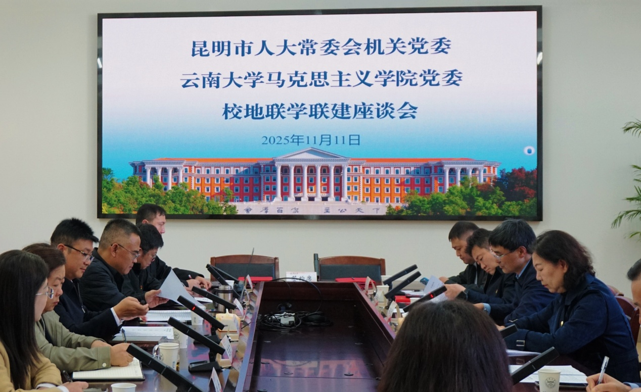 为深入学习贯彻党的二十届四中全会精神,深化校地合作、共筑思政教育高地,2025年11月11日,昆明市人大常委会党组成员、秘书长、机关党组书记李庆平一行莅临云南大学马克思主义学院开展校地共建活动。云南大学马克思主义学院党委班子成员及师生代表参与活动。